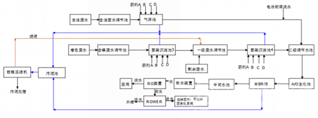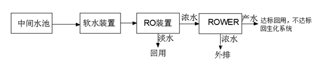 經(jīng)反滲透處理的濃水,利用離心泵把水打到ROWER膜堆中,在膜堆中通直流電源,利用膜的選擇透過性,使原水中的離子遷移到ROWER濃水中,達到除鹽的目的,ROWER產(chǎn)生的淡水若能滿足系統(tǒng)沖洗回用水的需要,則利用;否則進一步回到生化系統(tǒng)中,繼續(xù)進一步降低COD,從而進一步提高回用水的利用率。