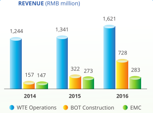 截止2016年12月底,公司已在中國的12個省、自治區(qū)額直轄市已運行了19家垃圾焚燒發(fā)電廠,運營日處理垃圾能力總計27430噸,裝機(jī)容量達(dá)469MW。2016年垃圾處理量增加17.4%達(dá)到813噸,實現(xiàn)了2016年稅前利潤和稅后利潤分別達(dá)到29.0%和32.3%的高增長,2016年實現(xiàn)歸屬股東的凈利潤為5.98億元,同比增長34.7%。