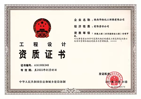 2017年5月5日,陜西華陸化工環(huán)保有限公司獲環(huán)境工程(水污染防治工程)專項(xiàng)設(shè)計(jì)甲級(jí)資質(zhì)證書。住房和城鄉(xiāng)建設(shè)部對(duì)照現(xiàn)行工程設(shè)計(jì)資質(zhì)標(biāo)準(zhǔn),經(jīng)過(guò)仔細(xì)篩選、反復(fù)核查申報(bào)材料,最終審核授予華陸環(huán)保環(huán)境工程(水污染防治工程)專項(xiàng)設(shè)計(jì)甲級(jí)資質(zhì)。本次從乙級(jí)資質(zhì)升級(jí)為甲級(jí)資質(zhì),是對(duì)華陸環(huán)保整體設(shè)計(jì)水平和綜合實(shí)力的全面考核。