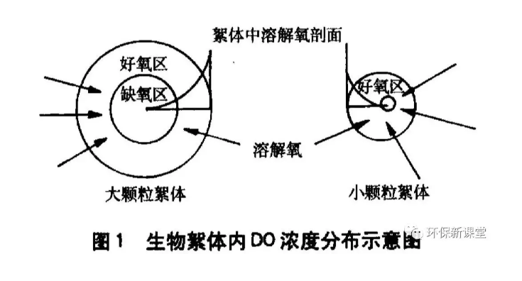 缺氧微環(huán)境理論是目前已被普遍接受的一種機(jī)理,被認(rèn)為是同步硝化/反硝化發(fā)生的主要原因之一。這一理論的基本觀點(diǎn)認(rèn)為:在活性污泥的絮體中,從絮體表面至其內(nèi)核的不同層次上,由于氧傳遞的限制原因,氧的濃度分布是不均勻的,微生物絮體外表面氧的濃度較高,內(nèi)層濃度較低。在生物絮體顆粒尺寸足夠大的情況下,可以在菌膠團(tuán)內(nèi)部形成缺氧區(qū),在這種情況下,絮體外層好氧硝化菌占優(yōu)勢(shì),主要進(jìn)行硝化反應(yīng),內(nèi)層為異樣反硝化菌占優(yōu)勢(shì),主要進(jìn)行反硝化反應(yīng)(如圖1)。除了活性污泥絮凝體外,一定厚度的生物膜中同樣可存在溶氧梯度,使得生物膜內(nèi)層形成缺氧微環(huán)境。