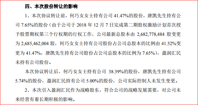 根據(jù)協(xié)議,何巧女將其持有的公司股份 82,935,718 股(占公司總股本的 3.09%)、唐凱將其持有的公司股份 51,337,383 股(占公司總股本的 1.91%),共計(jì) 134,273,101 股(占公司總股本的 5.00%)轉(zhuǎn)讓給盈潤匯民。