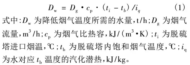 電站鍋爐的設(shè)計(jì)排煙溫度一般在120℃左右,但實(shí)際運(yùn)行時(shí)往往高于這個(gè)數(shù)值。在圖1所示的煙氣流程中,鍋爐的排煙經(jīng)脫硫塔噴淋脫硫、除霧脫水后溫度約為50℃,從脫硫塔排出。脫硫塔內(nèi)消耗的水量可根據(jù)脫硫塔內(nèi)煙氣的能量平衡計(jì)算,見式(1):