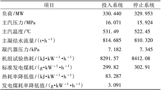 在330MW工況下分別在系統(tǒng)投入和停止的情況下,對(duì)機(jī)組進(jìn)行了性能試驗(yàn),主要數(shù)據(jù)見表4。