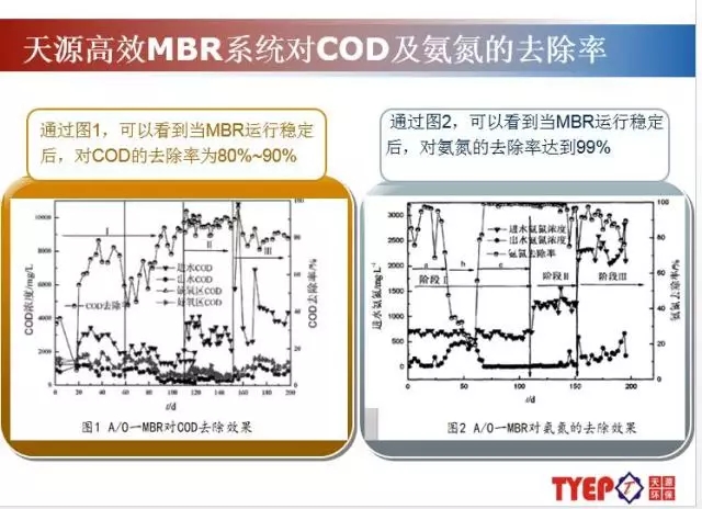 天源環(huán)保有10多年的深入摸索,對(duì)內(nèi)置式MBR,外置式MBR分別具備大量工程應(yīng)用,對(duì)其優(yōu)缺點(diǎn)很明顯,并且針對(duì)性解決各自的瓶頸問(wèn)題。由上圖可以看到當(dāng)MBR運(yùn)行穩(wěn)定后,對(duì)COD的去除率為80%~90%,對(duì)氨氮的去除率達(dá)到99%。