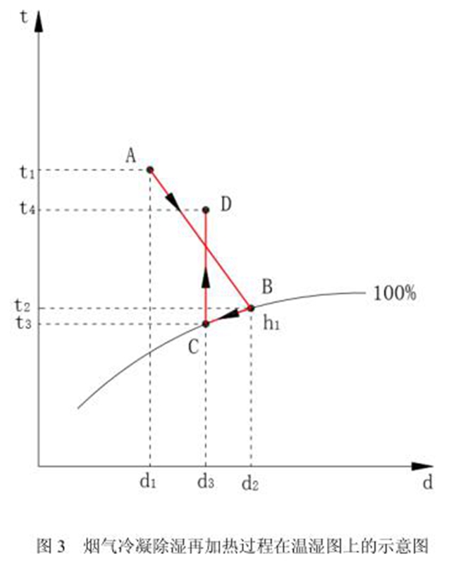 這是一個(gè)等焓增濕的過(guò)程。采用直接或間接的方式對(duì)飽和狀態(tài)B的煙氣進(jìn)行冷卻,部分汽態(tài)水釋放氣化潛熱發(fā)生相變而凝結(jié)為液態(tài)水,順著等100%的相對(duì)濕度線從B點(diǎn)處理到C點(diǎn),煙氣仍為相對(duì)濕度100%的飽和煙氣,但絕對(duì)濕度降低為d2-d3,煙氣中的水蒸氣含量降低。