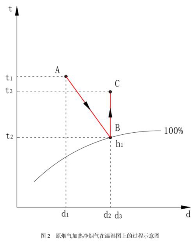 通過(guò)間壁式換熱器加熱凈煙氣,提高凈煙氣的溫度,降低凈煙氣的相對(duì)濕度。煙氣在焓濕圖上的處理過(guò)程如下圖 2 所示。