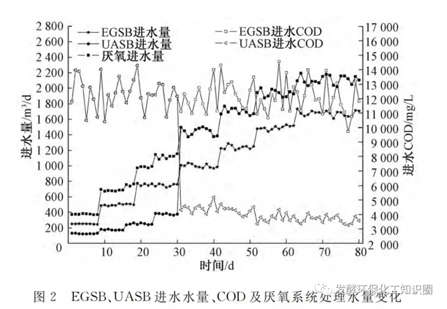 EGSB及UASB采用同類檸檬酸生產(chǎn)廠家厭氧顆粒污泥啟動,EGSB和UASB投加的含水率94%的顆粒污泥量分別是600m3和300m3,占各自反應(yīng)器容積的45%和30%。EGSB、UASB進(jìn)水水量、COD及厭氧系統(tǒng)處理水量變化見圖2。