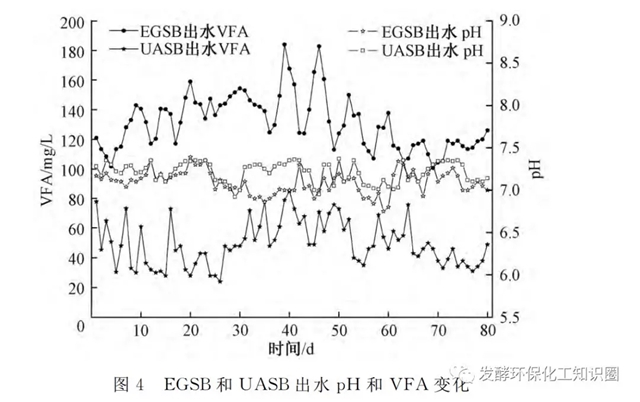 EGSB出水的VFA濃度在130±60mg/L;而UASB出水的VFA在50±25mg/L,UASB出水VFA低于EGSB出水VFA50%。上述EGSB和UASB的PH是適合甲烷菌生長的,反應(yīng)器也沒有VFA的積累。同時(shí)UASB出水的VFA比EGSB出水的VFA低,也說明UASB中有機(jī)物降解的更加徹底。