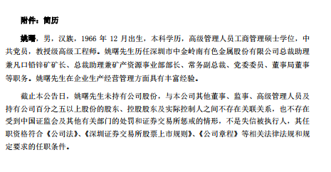 姚曙,男,漢族,1966年12月出生,本科學(xué)歷,高級(jí)管理人員工商管理碩士學(xué)位,中共黨員,教授級(jí)高級(jí)工程師。姚曙歷任深圳市中金嶺南有色金屬股份有限公司總裁助理兼凡口鉛鋅礦礦長(zhǎng)、總裁助理兼礦產(chǎn)資源事業(yè)部部長(zhǎng)、常務(wù)副總裁、黨委委員、董事局董事等職務(wù)。其在企業(yè)生產(chǎn)經(jīng)營(yíng)管理方面具有豐富經(jīng)驗(yàn)。