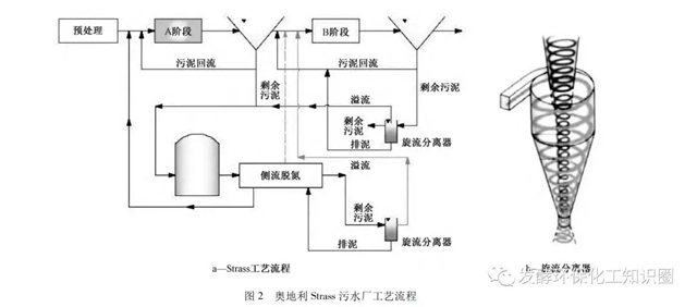 斯特拉斯污水處理廠以主流傳統(tǒng)工藝( AB法)與側(cè)流新型脫氮工藝( 厭氧氨氧化) 相結(jié)合的方式,運(yùn)行工藝如圖2a所示??芍? 污水經(jīng)過預(yù)處理進(jìn)入A段吸附( adsorption) 去除有機(jī)物,可有效防止過高的有機(jī)物對(duì)厭氧氨氧化菌的抑制。之后污水進(jìn)入B段生物降解過程( biodegradation) ,即采用一體式厭氧氨氧化工藝脫氮。在A段吸附了大量有機(jī)物的污泥,經(jīng)過排泥、剩余污泥濃縮、厭氧消化和脫水等過程后,產(chǎn)生的污泥厭氧消化液和污泥脫水液氨氮濃度較高,采用側(cè)流厭氧氨氧化DEMON工藝脫氮。側(cè)流部分通過旋流分離器( 圖2b) 分離絮體( 主要是AOB)和顆粒污泥( 主要AnAOB) ,從而富集厭氧氨氧化菌。在主流工藝中,除了傳統(tǒng)方式的污泥回流外,還需要回流測(cè)流工藝的污泥實(shí)現(xiàn)對(duì)AOB和AnAOB生物強(qiáng)化。除此之外,該工藝還將部分污泥消化液定期回流至B階段,進(jìn)行氨氮負(fù)荷的調(diào)控。