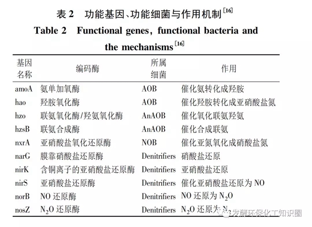 部分亞硝化-厭氧氨氧化過程主要依賴于AOB與AnAOB,其中功能細(xì)菌、功能基因及作用原理如表2所示,除AOB和AnAOB功能基因以外,還列出了NOB和反硝化細(xì)菌的功能基因。在部分亞硝化-厭氧氨氧化反應(yīng)過程中需要調(diào)控菌群結(jié)構(gòu),促進(jìn)AOB和AnAOB占優(yōu)勢(shì),其調(diào)控方法在第2、3部分進(jìn)行討論。