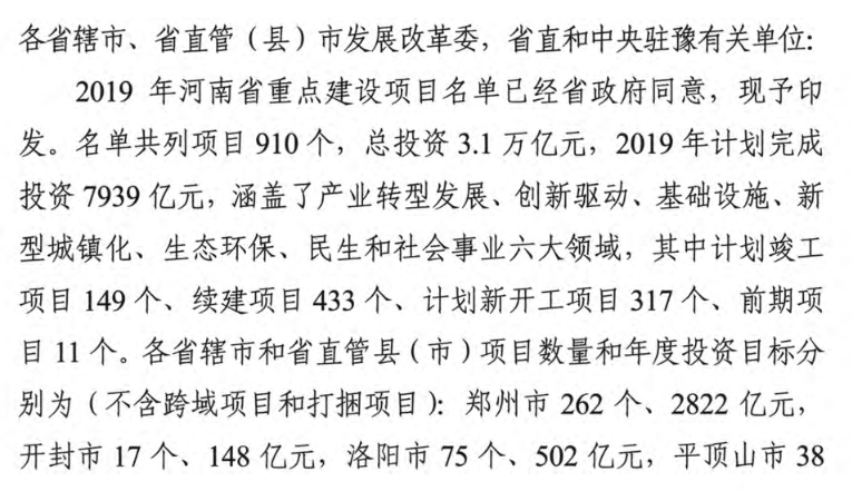 2月11日,河南省發(fā)改委發(fā)布《關于印發(fā)2019年河南省重點建設項目名單的通知》。名單共列項目910個,總投資3.1萬億元,2019年計劃完成投資7939億元,涵蓋了產業(yè)轉型發(fā)展、創(chuàng)新驅動、基礎設施、新型城鎮(zhèn)化、生態(tài)環(huán)保、民生和社會事業(yè)六大領域18個行業(yè)。其中計劃竣工項目149個、續(xù)建項目433個、計劃新開工項目317個、前期項目11個。