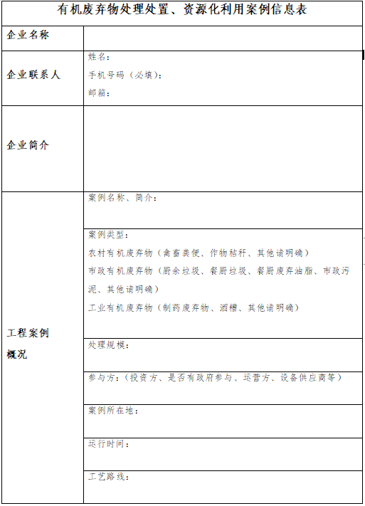 在此背景下,中國環(huán)聯(lián)擬面向行業(yè)征集“有機(jī)廢棄物處理處置、資源化利用典型案例”,征集范圍包括農(nóng)村有機(jī)廢棄物(作物秸稈、畜禽養(yǎng)殖廢棄物等)、市政有機(jī)廢棄物(廚余垃圾、餐廚垃圾、餐廚廢棄油脂、市政污泥等)、工業(yè)有機(jī)廢棄物(制藥有機(jī)廢棄物、酒精廢水等)的處理處置及資源化利用項目案例。請有意向的企業(yè)按附件填寫申報表,并發(fā)郵件至以下郵箱地址。
