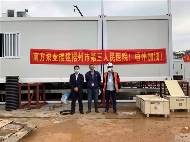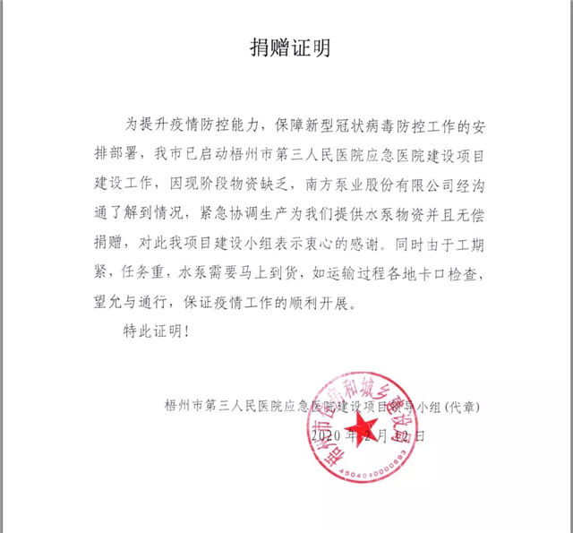 同時,2月中下旬,梧州市啟動第三人民醫(yī)院應急醫(yī)院建設項目建設工作,因現階段物資缺乏,南方泵業(yè)股份有限公司經溝通了解到情況后,緊急協調生產為醫(yī)院提供水泵物資并且無償捐贈,由于工期緊,任務重,南方泵業(yè)積極協調生產及運輸,確保物資準時到位,保障醫(yī)院建設工作,保證疫情工作的順利開展。