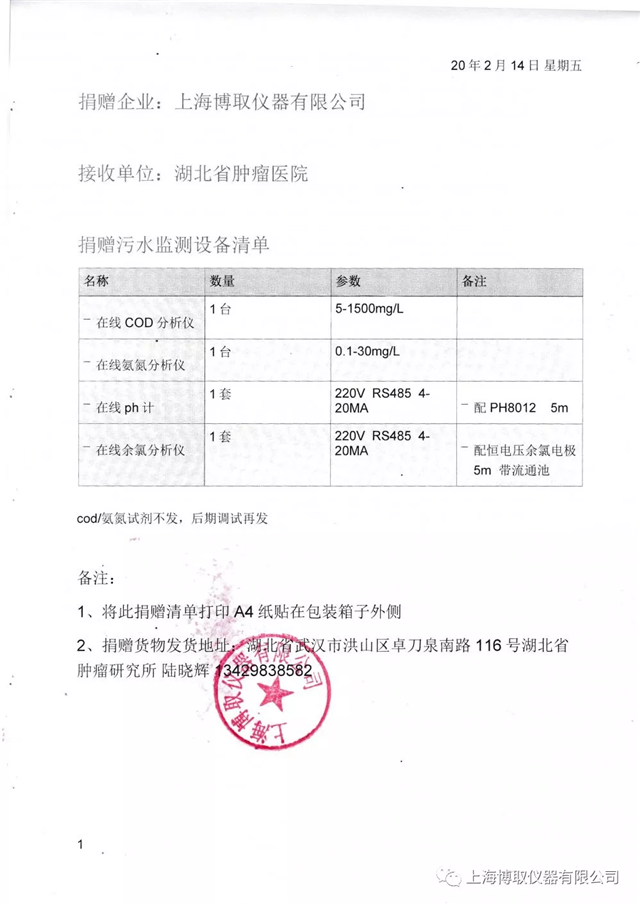 為更好地讓武漢當?shù)蒯t(yī)院救治更多的患者,確保疫情消滅成果,堅決打贏疫情防控阻擊戰(zhàn),上海博取儀器有限公司決定為湖北省腫瘤醫(yī)院捐贈一批水質監(jiān)測儀器儀表,在線COD分析儀、在線氨氮分析儀、在線PH計、在線余氯,作為一個有社會責任感的企業(yè),上海博取儀器堅決跟隨國家腳步抗擊此次疫情,為了能讓武漢重見光明,也盡一份綿薄之力。