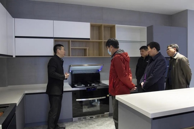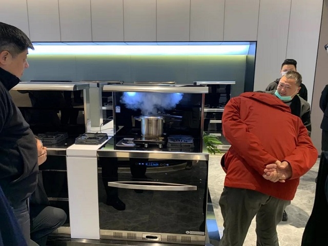 在結(jié)束參觀后,葉局長(zhǎng)一行來(lái)到了永發(fā)機(jī)電的兄弟公司——廚壹堂集成灶參觀考察。在高總的陪同下,葉局長(zhǎng)一行參觀了公司剛剛竣工的1000㎡+全新展廳,在近距離觀察和了解了廚壹堂系列集成灶的各項(xiàng)功能后,一眾領(lǐng)導(dǎo)對(duì)展廳的設(shè)計(jì)理念以及廚壹堂集成灶99.9%的油煙吸凈率大加贊賞。