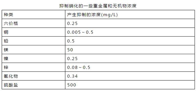 某些重金屬離子、絡(luò)合陰離子、氰化物以及一些有機(jī)物質(zhì)會(huì)干擾或破壞硝化細(xì)菌的正常生理活動(dòng)。當(dāng)這些物質(zhì)在污水中的濃度較高,便會(huì)抑制生物硝化的正常運(yùn)行。例如,當(dāng)鉛離子大于0.5mg/L、酚大于5.6mg/L、硫脲大于0.076mg/L時(shí),硝化均會(huì)受到抑制。有趣的是,當(dāng)NH3-N濃度大于200mg/L時(shí),也會(huì)對(duì)硝化過(guò)程產(chǎn)生抑制,但城市污水中一般不會(huì)有如此高的NH3-N濃度。