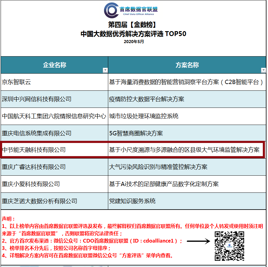 近日,由首席數(shù)據(jù)官聯(lián)盟發(fā)起的第四屆【金數(shù)榜】中國(guó)大數(shù)據(jù)優(yōu)秀解決方案及案例TOP50評(píng)選活動(dòng)正式公布評(píng)選結(jié)果,中節(jié)能天融科技有限公司(以下簡(jiǎn)稱“天融科技”)憑借“基于小尺度溯源與多源融合的區(qū)縣級(jí)大氣環(huán)境監(jiān)管解決方案”入選中國(guó)大數(shù)據(jù)優(yōu)秀解決方案TOP50。