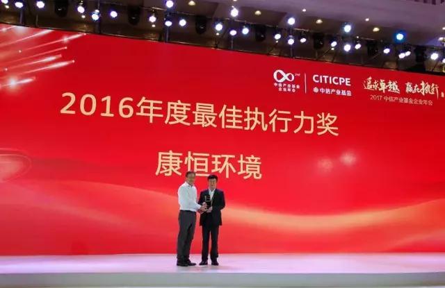 “2017中信產(chǎn)業(yè)基金企業(yè)年會”在杭州盛大召開,多家中信產(chǎn)業(yè)基金控股企業(yè)參加本屆年會。在本屆年會中,康恒環(huán)境斬獲六項獎項中的三項,榮獲中信產(chǎn)業(yè)基金2016年度唯一一家“最有價值企業(yè)”獎,同時榮獲“2016年度最佳執(zhí)行力獎”,康恒環(huán)境董事長兼CEO龍吉生博士榮獲“2016年度優(yōu)秀CEO獎"。