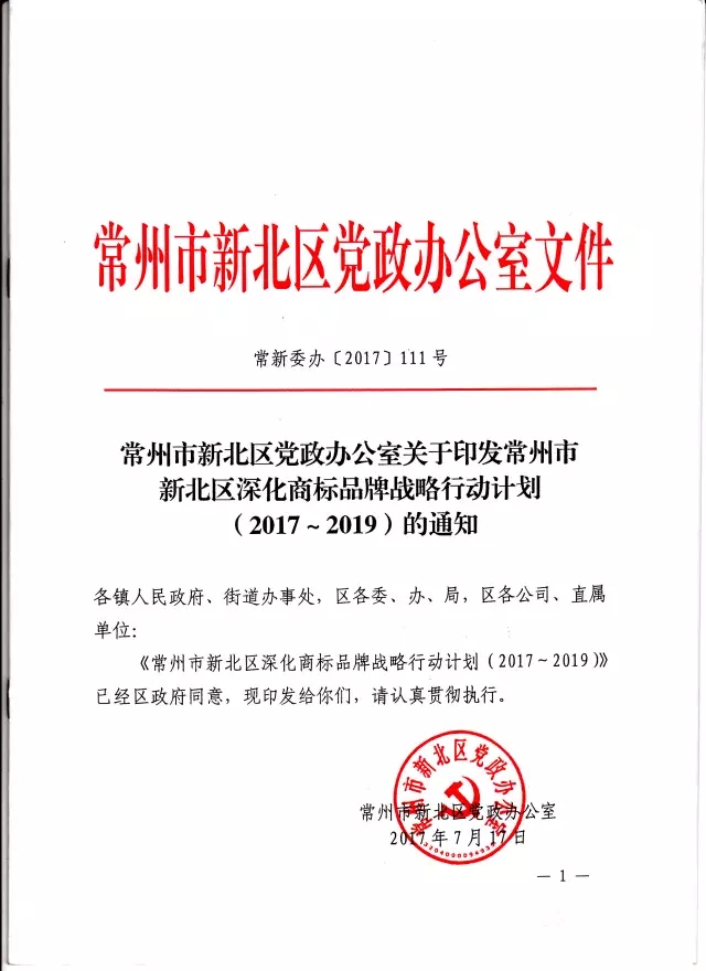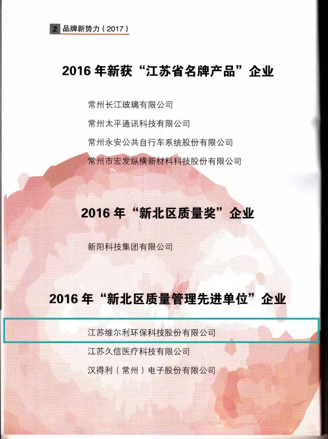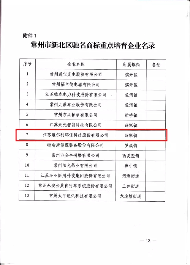 在《常州市新北區(qū)黨政辦公室關(guān)于印發(fā)常州市新北區(qū)深化商標(biāo)品牌戰(zhàn)略行動(dòng)計(jì)劃(2017-2019)的通知》(常新委辦〔2017〕111號(hào))文件中,提出深化商標(biāo)品牌戰(zhàn)略建設(shè),將維爾利環(huán)保作為常州市新北區(qū)馳名商標(biāo)重點(diǎn)培育企業(yè),實(shí)施“產(chǎn)業(yè)品牌提升”工程,打響產(chǎn)業(yè)品牌特色優(yōu)勢,培育細(xì)分行業(yè)新品牌。