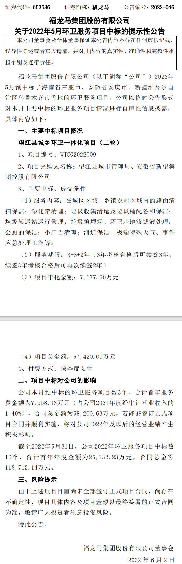 2022年6月2日,福龍馬集團(tuán)股份有限公司(下稱“福龍馬”)發(fā)布“關(guān)于2022年5月環(huán)衛(wèi)服務(wù)項(xiàng)目中標(biāo)的提示性公告”。