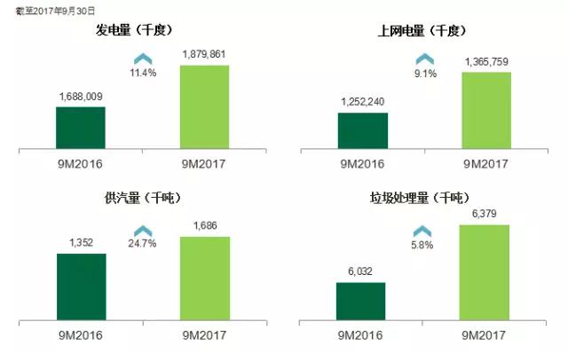 2017年前三季度,集團(tuán)共計(jì)處理生活垃圾量638萬(wàn)噸,較2016年同期增加5.8%。與去年同期相比,集團(tuán)供電量以及供汽量增幅較大,分別增長(zhǎng)9.1%,24.7%。主要得益于運(yùn)營(yíng)項(xiàng)目總處理量穩(wěn)定上升,加上新項(xiàng)目、改擴(kuò)建項(xiàng)目的投入運(yùn)作,提升可運(yùn)營(yíng)服務(wù)效益。