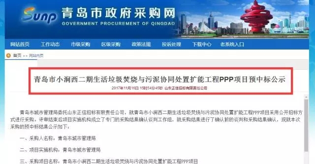 11月16日,據(jù)青島市公共資源交易中心消息,青島市小澗西二期生活垃圾焚燒與污泥協(xié)同處置擴(kuò)能工程PPP項目已公布預(yù)中標(biāo)公示,上海康恒環(huán)境股份有限公司為預(yù)成交供應(yīng)商。