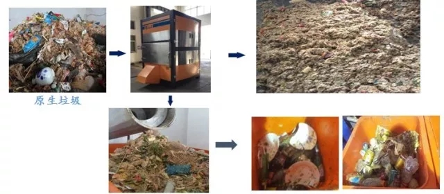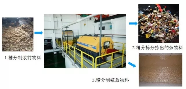 精分制漿機對物料進行二次雜物分揀及破碎制漿,將物料中粒徑大小在20mm以上的雜物分離出系統(tǒng),如垃圾中的塑料、竹木、陶瓷、玻璃瓶、瓶蓋、筷子、骨頭以及貝殼等海鮮類硬物質(zhì)雜物,雜物外運處理。同時對大塊有機質(zhì)進行破碎得到以有機質(zhì)8mm以下粒度的漿狀物料為主的均質(zhì)物料。