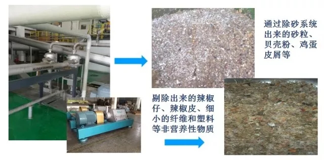 除砂裝置有效去除有機漿料中沙粒、貝殼、玻璃、瓷片、砂石等砂質(zhì)雜物,除砂后的物料經(jīng)除雜分離機分離出細纖維、塑料等輕飄物,雜物外運。