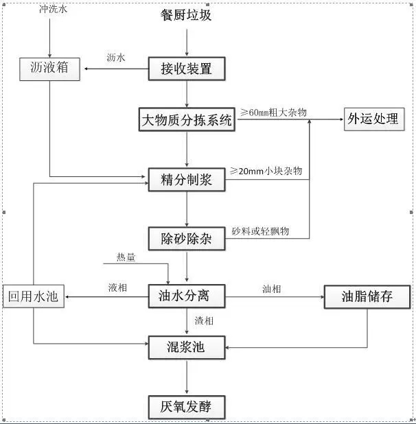 慈溪餐廚垃圾預(yù)處理工藝采用機械精細化分揀制漿工藝,即“物料接收+大物質(zhì)分揀+精分制漿+除砂除雜+油水分離”工藝,通過大物質(zhì)分揀+精分制漿+除砂除雜逐級減量化設(shè)計,可有效去除物料中的雜物,保證了最大化地將一些對后道工序設(shè)備損壞最大的硬性物質(zhì)如:瓷盤、玻璃瓶、金屬物質(zhì)、貝殼、骨頭等和纖維類輕性物質(zhì)如:塑料、餐巾以及砂粒和輕飄物如塑料、辣椒籽、木質(zhì)纖維等有效地分離出來,得到的液相做油脂分離,避免這些物質(zhì)對輸送泵組、離心提油設(shè)備的磨損和堵塞。