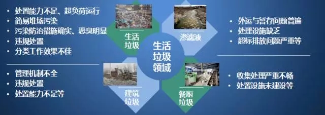 2016.1.4至2017.5.28三批中央環(huán)保督察工作中暴露了環(huán)衛(wèi)領(lǐng)域存在問(wèn)題:生活垃圾處理設(shè)施不足/違規(guī)處置/隨意傾倒嚴(yán)重、簡(jiǎn)易垃圾填埋場(chǎng)存在、滲濾液偷排或超標(biāo)排放嚴(yán)重、建筑垃圾管理不善、生活垃圾分類工作滯后和臭氣擾民等。