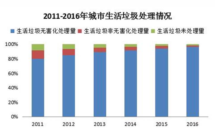而在35%的要求之下,還存在著相當(dāng)高的生活垃圾處理率:《2017年全國大、中城市固體廢物污染環(huán)境防治年報》顯示,2016年,我國214個大、中型城市生活垃圾處理率達99.1%;《2016年城鄉(xiāng)建設(shè)統(tǒng)計公報》顯示,到2016年末,全國城市生活垃圾無害化處理率96.62%。
