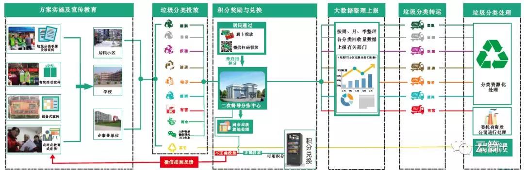 告別傳統(tǒng)的四分類(餐廚、有害、可回收、其他),采用更精細的細分類模式,是為了將分類工作落到實處,告別空談。并以多種顏色區(qū)別不同分類,使得分類更直觀,清晰明了,達到教育意義。通過積分回饋的方式帶動居民垃圾分類的積極性,使得各分類垃圾價值達到最大化。