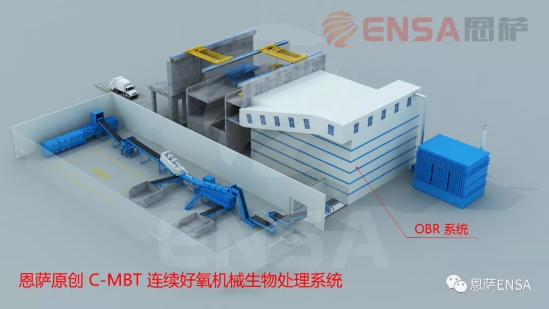 為解決上述問題,恩薩原創(chuàng)性地提出大規(guī)模智能連續(xù)好氧機械生物處理技術(以下簡稱“C-MBT”,即:Continuous Mechanical Biological Treatment),即采用 OBR 連續(xù)高效好氧生物反應器(恩薩專利)技術(以下簡稱“OBR”, 即:Oxic Bio-Reactor ),針對已經過初步破碎預處理后的生活垃圾等物料,在封閉的環(huán)境下,以連續(xù)進出料和自動翻拋的方式持續(xù)好氧發(fā)酵的過程,從而在相對較短的發(fā)酵時間內持續(xù)獲得較低含水率的高熱值物料。