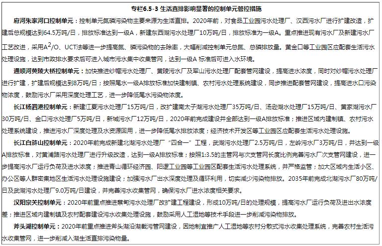 加快城鎮(zhèn)污水處理設(shè)施提標(biāo)改造。梁子湖、斧頭湖等敏感區(qū)域內(nèi)的現(xiàn)有城鎮(zhèn)污水處理設(shè)施2016年底前達(dá)到一級A排放標(biāo)準(zhǔn);新建城鎮(zhèn)污水處理設(shè)施執(zhí)行一級A排放標(biāo)準(zhǔn),現(xiàn)有處理設(shè)施需強化脫氮除磷工藝,逐步達(dá)到一級A排放標(biāo)準(zhǔn)。2020年前,灄水灄口控制單元、倒水龍口控制單元、舉水沐家徑控制單元、長江白滸山控制單元、長江楊泗港控制單元等重點區(qū)域內(nèi)污水廠應(yīng)完成提標(biāo)改造,出水達(dá)到一級A排放標(biāo)準(zhǔn);2035年前,研究基于水環(huán)境質(zhì)量目標(biāo)的城鎮(zhèn)生活污水廠出水排放指標(biāo)及要求,完成全市城鎮(zhèn)污水處理廠達(dá)標(biāo)改造工程。