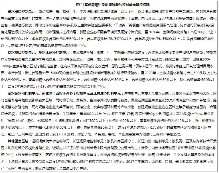 優(yōu)化畜禽及水產(chǎn)養(yǎng)殖布局。2017年前,依法關(guān)閉或搬遷禁養(yǎng)區(qū)內(nèi)的畜禽養(yǎng)殖場(小區(qū))和養(yǎng)殖專業(yè)戶,對四環(huán)線公路以外的未達(dá)標(biāo)小型養(yǎng)殖小區(qū)按照規(guī)模標(biāo)準(zhǔn)實施改造升級,不再擴大限制發(fā)展區(qū)養(yǎng)殖規(guī)模,同時做好糞污資源化利用和處理。2018年底前,限制養(yǎng)殖區(qū)規(guī)模以下養(yǎng)殖場全部退出,規(guī)模以上畜禽養(yǎng)殖場(小區(qū))須實現(xiàn)糞污資源化利用,達(dá)到環(huán)保要求;未達(dá)到環(huán)保要求的,依法責(zé)令停止生產(chǎn)或者使用,并處以罰款。鼓勵適宜養(yǎng)殖區(qū)內(nèi)散養(yǎng)戶逐步退出,支持發(fā)展高標(biāo)準(zhǔn)、現(xiàn)代化的畜禽養(yǎng)殖場(小區(qū)),實現(xiàn)畜禽養(yǎng)殖退養(yǎng)平衡。逐步退出水產(chǎn)“三網(wǎng)”養(yǎng)殖。2017年1月底前,拆除梁子湖、湯遜湖、東湖、斧頭湖等重點湖泊的漁業(yè)“三網(wǎng)”設(shè)施;2017年12月底前,完成全市湖泊保護目錄中湖泊的漁業(yè)“三網(wǎng)”設(shè)施拆除。開展?jié)O業(yè)禁養(yǎng)區(qū)劃分,優(yōu)化水產(chǎn)養(yǎng)殖空間布局。中心城區(qū)40個湖泊列入漁業(yè)禁止養(yǎng)殖區(qū),不得開展經(jīng)營性水產(chǎn)養(yǎng)殖;其他126個湖泊由各轄區(qū)人民政府確定禁、限養(yǎng)殖分類,原則上列入漁業(yè)限制養(yǎng)殖區(qū),對列入限制養(yǎng)殖區(qū)的由各區(qū)人民政府依據(jù)湖泊水質(zhì)狀況制定養(yǎng)殖水域、面積、種類、密度等養(yǎng)殖規(guī)范,實行不投肥、不投藥、不投飼的生態(tài)養(yǎng)殖模式。到2020年,禁養(yǎng)區(qū)內(nèi)全部畜禽養(yǎng)殖及水產(chǎn)養(yǎng)殖企業(yè)退出;限養(yǎng)區(qū)內(nèi)規(guī)模以下畜禽養(yǎng)殖企業(yè)退出,完成水產(chǎn)禁、限養(yǎng)殖區(qū)域劃分,退出全部湖庫禁養(yǎng)區(qū)內(nèi)水產(chǎn)養(yǎng)殖,其他區(qū)域內(nèi)實施水產(chǎn)生態(tài)養(yǎng)殖改造。
