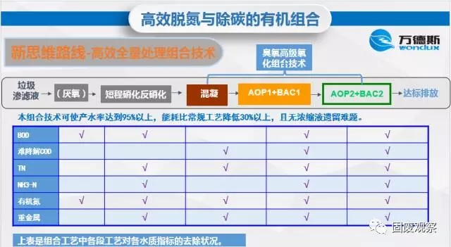 南京萬德斯環(huán)??萍脊煞萦邢薰旧虾7止究偨?jīng)理陳建湧介紹,在滲瀝液脫碳技術(shù)上,萬德斯環(huán)保采用“厭氧+高效生化+納濾+臭氧高級氧化AOP(Advanced Oxidation Process)” 為主的工藝,在高效脫氮中,利用短程硝化技術(shù),節(jié)省供氧量25%、節(jié)省反硝化碳源40%、減少污泥生成量50%、減少投堿量、縮短反應(yīng)時間。在滲瀝液高效全量處理中,組合利用 “厭氧+短程硝化反硝化+臭氧高級氧化(混凝+AOP1+BAC1+AOP2+BAC2)”技術(shù),能使產(chǎn)水率達到95%以上,且無濃縮液遺留難題。除技術(shù)創(chuàng)新外,陳建湧總經(jīng)理認為,提倡垃圾干濕分類,采取各種有效措施減少各種好水分包括雨水進入垃圾,以及垃圾堆場等,對降低滲瀝液處理成本具有非常重要的意義。