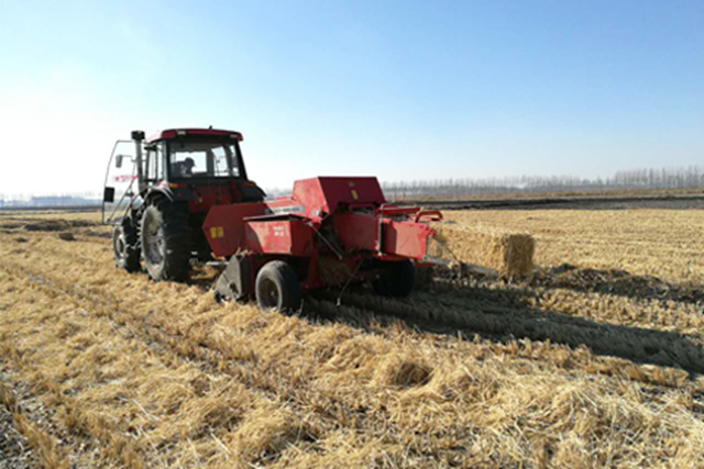 圖為水稻秸稈打捆現(xiàn)場應(yīng)用“夢創(chuàng)”圓捆9YG—1.3型打捆機,每小時可打水稻秸稈捆20捆,每捆重量約為230KG。