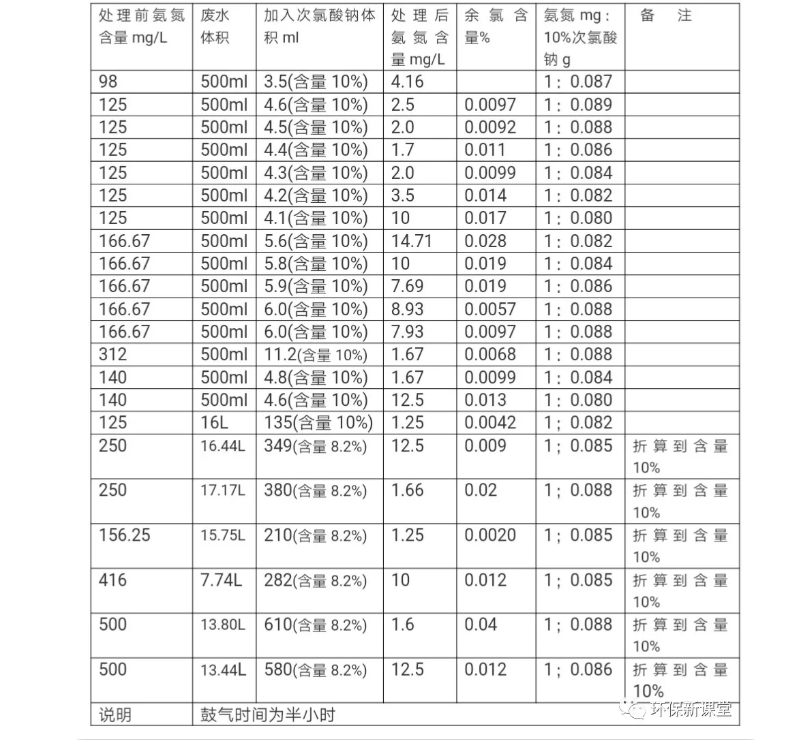 1.根據(jù)實驗數(shù)據(jù)可看出,按氨氮重量mg:10%次氯酸鈉重量g=1:(0.08~0.088)時都可以使氨氮達(dá)標(biāo),但在1:0.088時處理效果最好,鼓氣半小時情況下氨氮除至最低值,且余氯含量低。