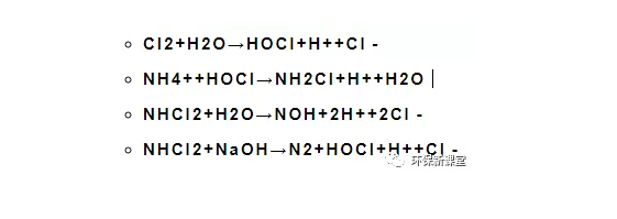 折點(diǎn)加氯法處理后的出水在排放前一般需要用活性碳或二氧化硫進(jìn)行反氯化,以去除水中殘留的氯。1mg殘留氯大約需要0.9~1.0mg的二氧化硫。在反氯化時會產(chǎn)生氫離子,但由此引起的pH值下降一般可以忽略,因此去除1mg殘留氯只消耗2mg左右(以CaCO3計)。折點(diǎn)氯化法除氨機(jī)理如下: