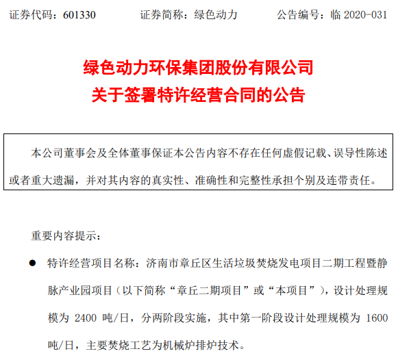 綠色動力環(huán)保6月3日公布一則關(guān)于簽署特許經(jīng)營合同的公告,公告顯示綠色動力與濟南市章丘區(qū)環(huán)境衛(wèi)生管護中心簽署《章丘區(qū)生活垃圾焚燒發(fā)電項目二期工程暨靜脈產(chǎn)業(yè)園項目特許經(jīng)營協(xié)議》,項目總投資約15億元(人民幣。下同),第一階段總投資約8.5億元,其中資本金約2.55億元。 綠色動力環(huán)保集團指出,該項目采用...