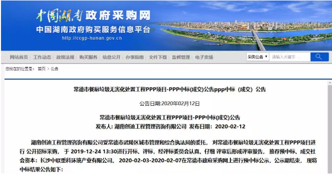 常德市餐廚垃圾無害化處置工程PPP項目近日發(fā)布中標結(jié)果公示。中標供應(yīng)商為:長沙中聯(lián)重科環(huán)境產(chǎn)業(yè)有限公司(以下簡稱中聯(lián)環(huán)境)。合作期限為30年。 該項目于 2019-12-24 13:30進行開標、評標,經(jīng)評標委員會認真、仔細 評審后形成評審報告,推薦預(yù)中標、成交社會資本:長沙中聯(lián)重科環(huán)境產(chǎn)業(yè)有限公司...