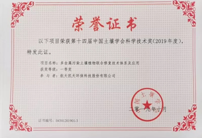 2019年10月,經(jīng)中國(guó)土壤學(xué)會(huì)項(xiàng)目評(píng)選委員會(huì)評(píng)審決定,航天凱天環(huán)保科技股份有限公司與中山大學(xué)、廣東省耕地肥料總站聯(lián)合申報(bào)的“多金屬污染土壤植物聯(lián)合修復(fù)技術(shù)體系及應(yīng)用”獲中國(guó)土壤學(xué)會(huì)科學(xué)技術(shù)獎(jiǎng)一等獎(jiǎng)。 該技術(shù)體系將航天凱天環(huán)保自主研發(fā)的重金屬土壤修復(fù)技與中山大學(xué)研發(fā)的多金屬污...