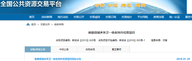 河南省新蔡縣城鄉(xiāng)環(huán)衛(wèi)一體化特許經(jīng)營(yíng)項(xiàng)目發(fā)布單一來(lái)源采購(gòu)招標(biāo)公告,擬推薦中國(guó)光大國(guó)際有限公司下屬光大生態(tài)資源(深圳)有限公司為項(xiàng)目供應(yīng)商。 擬采購(gòu)內(nèi)容:彌陀寺鄉(xiāng)、龍口鎮(zhèn)、韓集鎮(zhèn)、孫召鎮(zhèn)、李橋鎮(zhèn)、櫟城鄉(xiāng)、棠村鎮(zhèn)、宋崗鄉(xiāng)、關(guān)津鄉(xiāng)、河塢鄉(xiāng)、佛閣寺鎮(zhèn)、余店鎮(zhèn)、陳店鎮(zhèn)、磚店鎮(zhèn)、黃樓鎮(zhèn)、澗頭鄉(xiāng)、化莊鄉(xiāng)、楊莊戶(hù)鄉(xiāng)、...