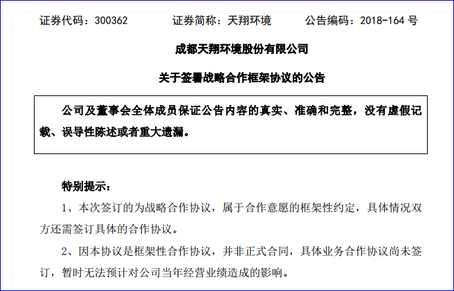 2018年12月24日,天翔環(huán)境公告稱,公司與四川能投水務投資有限公司在12月21日已經(jīng)正式簽訂了《戰(zhàn)略合作框架協(xié)議》。此次戰(zhàn)略合作協(xié)議的簽訂,意味著陷入債務泥淖的天翔環(huán)境,再次迎來又一家地方國資的的“馳援”。 根據(jù)協(xié)議內(nèi)容,雙方擬在本協(xié)議正式簽署后組建專業(yè)團隊,對所涉及合作...