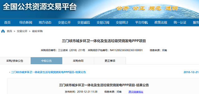 2018年12月21日,河南省三門峽市城鄉(xiāng)環(huán)衛(wèi)一體化及生活垃圾焚燒發(fā)電PPP項(xiàng)目發(fā)布結(jié)果公告,結(jié)果具體如下: 一標(biāo)段預(yù)中標(biāo)社會(huì)資本方: 單位名稱:北京環(huán)境有限公司(牽頭人)、北京中科仁和環(huán)??萍加邢薰?聯(lián)合體成員) 報(bào)價(jià)大寫:壹億零伍佰玖拾捌萬(wàn)捌仟玖佰玖拾伍元叁角貳分每年 小寫:¥10598899...