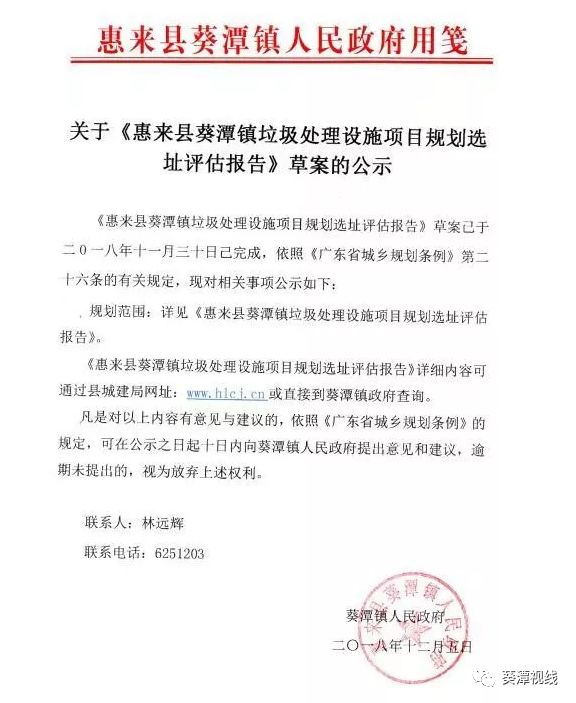 日前廣東揭陽惠來縣葵潭鎮(zhèn)政府發(fā)布了關(guān)于《惠來縣葵潭鎮(zhèn)垃圾處理設(shè)施項目規(guī)劃選址評估報告》草案的公示,具體內(nèi)容如下:原標(biāo)題:關(guān)于《惠來縣葵潭鎮(zhèn)垃圾處理設(shè)施項目規(guī)劃選址評估報告》草案的公示